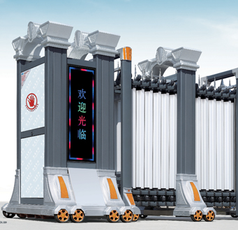 4.電動伸縮門體有LED彩燈,靜態顯示屏字樣,全遙控。